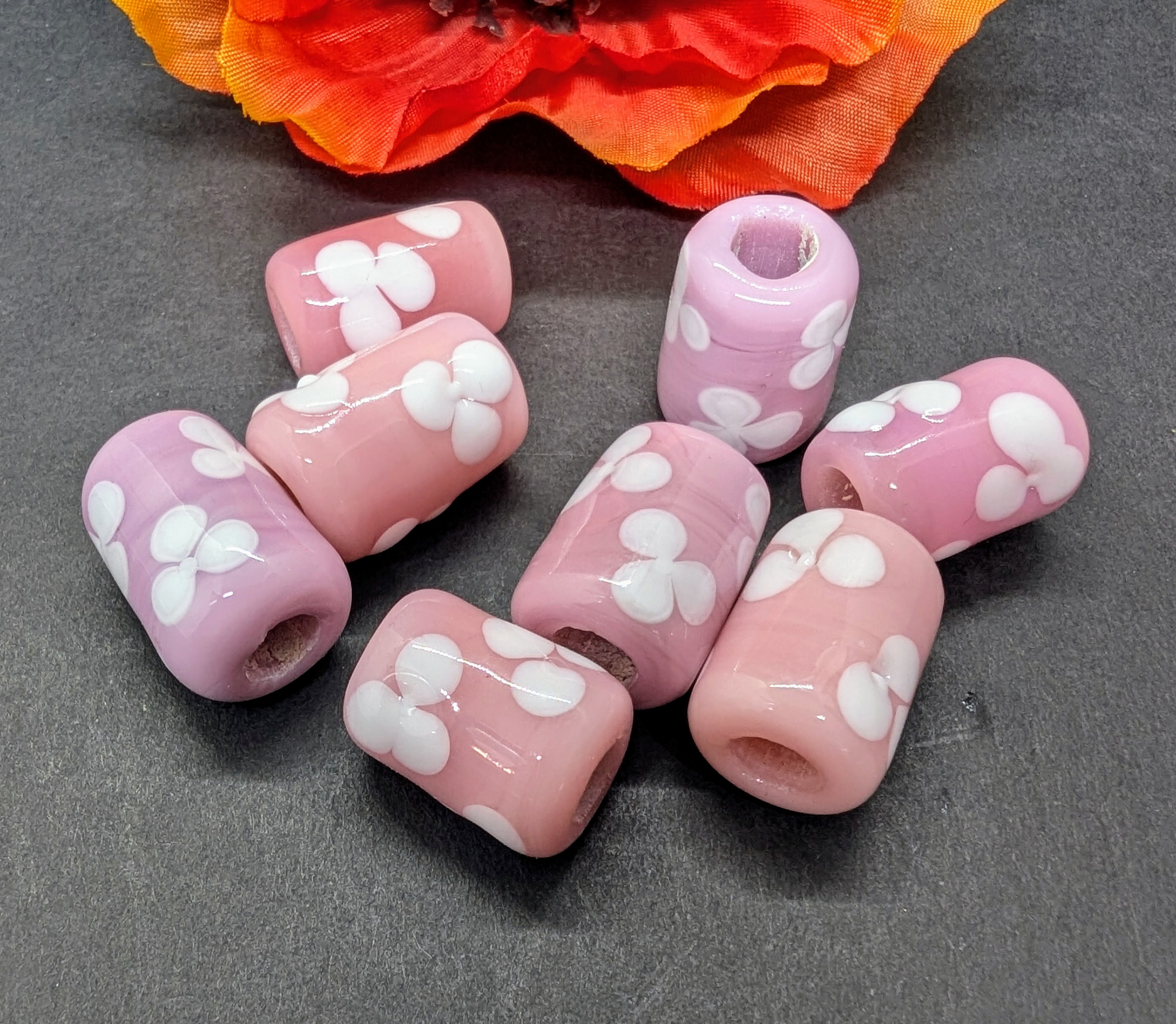 This pink glass bead, with a 5 mm hole diameter, is made of Murano glass. This type of glass is a tarnish glass – in its raw state, it is white. It only acquires its pink color during processing through a process of cooling and heating phases.